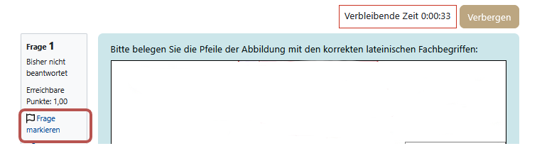 Hinweis: Wenn die "Verbleibende Zeit" abgelaufen ist, wird Ihre Prüfung automatisch abgegeben und ist somit beendet.
