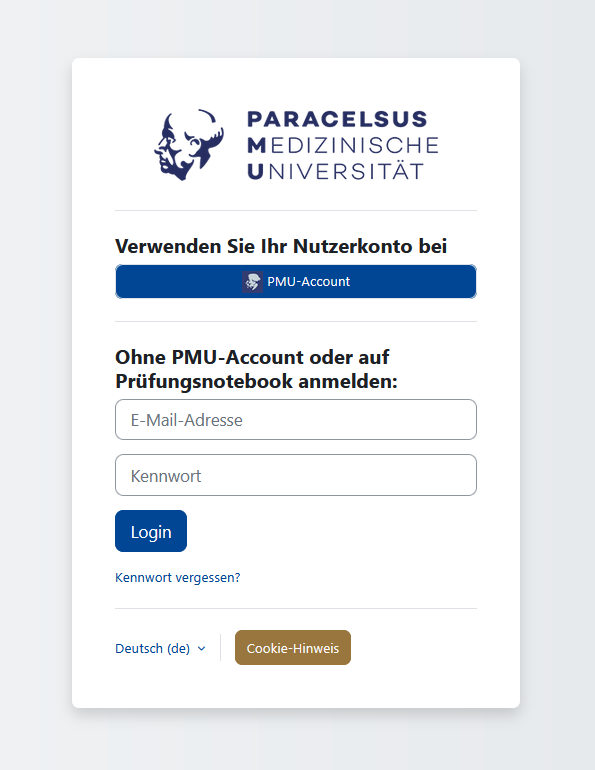 Wenn Sie ein PMU-Account besitzen (PMU-Zugangsdaten und Email-Adresse), dann können Sie sich mit diesen Daten auch in die Moodle-Lernplattform einloggen. Ihr Anmeldename entspricht seit dem 16.06.2025 ihrer PMU E-Mailadresse!