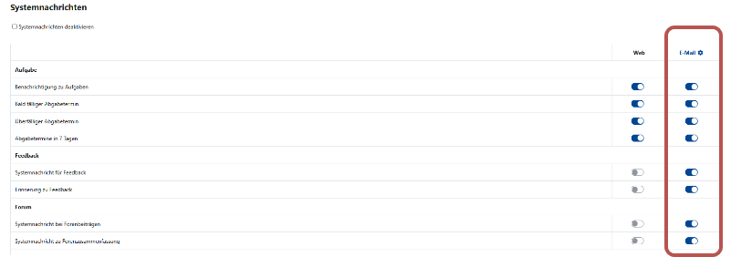 b) einzelne Systemnachrichten (de)aktivieren indem Sie die gewünschten Schalter "E-Mail" rechts auf "aus" oder "an" setzen.
