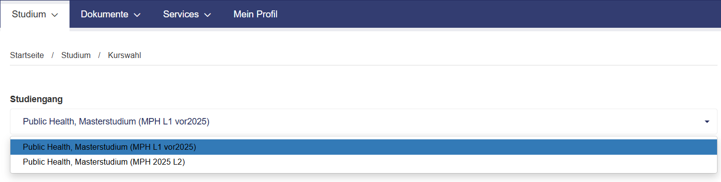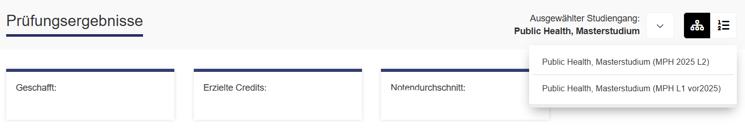 Sollten Sie in mehr als einem Studium immatrikuliert sein, erhalten sie in der oberen Leiste die Auswahl für den Studiengang von Interesse.
