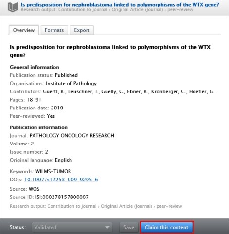 3. After finding the research output you want to claim, click on it and the click on Claim this content in the footer of the editor window: