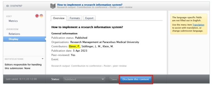 3. After finding the research output you want to claim, click on it and the click on Disclaim this content in the footer of the editor window: