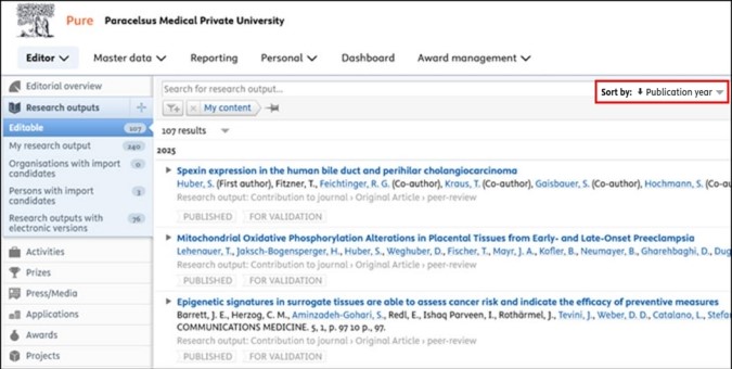 3. Sort the publications in descending order by ‘Publication year’ so that the publications from 2025 are displayed at the top: