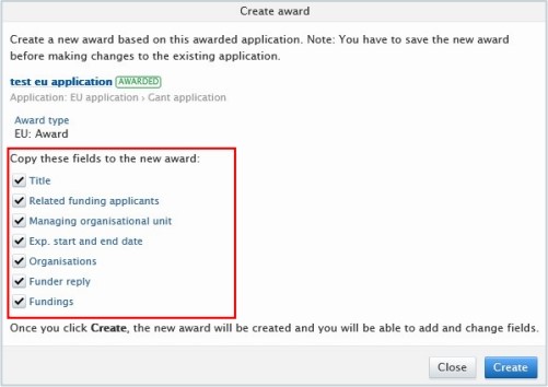 3. Now you can create an award based on the awarded application by clicking on the button “Save and create award”: