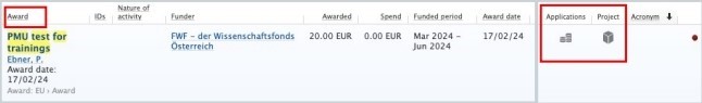 If your Application is awarded, you need to create both an Award and a Project as well. This method can be used for competitive Projects, such as PMU-RIF, FWF or EU Projects, etc.