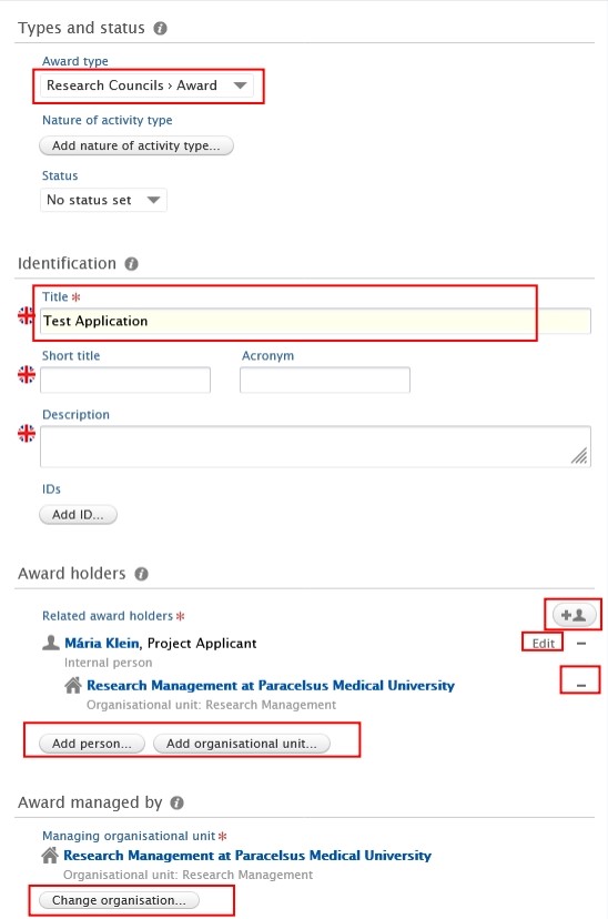 Click on Edit on the right side if you wish to change your role or your organisational unit. By clicking on the Add person button (left corner) or the add person icon (right corner) you can add other persons who are related to this application. Click on Add organisational unit if you wish to register additional organisations.