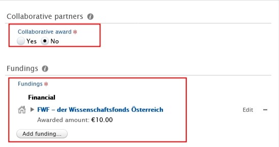 · If you selected Yes in the Collaborative partners field (see point 5), you can also manage split funding among project partners in addition to the fields mentioned above.