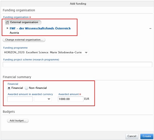 · If you selected No in the Collaborative partners field (see point 5), you can manage the funding organisation, funding program, financial summary and add budgets as needed.