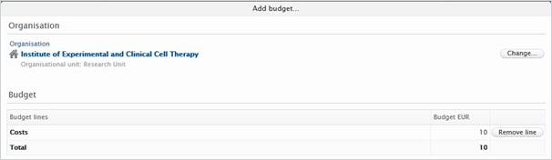 Optional: Click on “Add budget” in the dialog window if you need to register a split between internal organisational units: