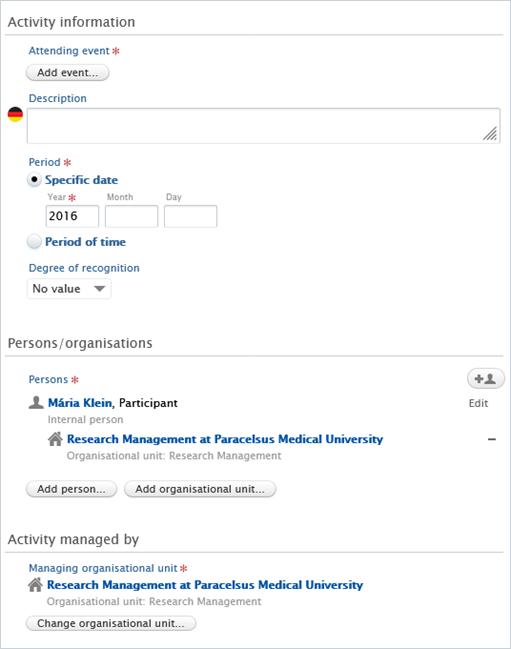 Pure automatically adds the content creator with the Organiser role, along with their organisational unit, to this field. Click on Edit on the right side if you wish to change your role or your organisational unit. By clicking on the Add person button (left corner) or the add person icon (right corner) you can add other persons who are related to this activity. Click on Add organisational unit if you wish to register additional organisations.